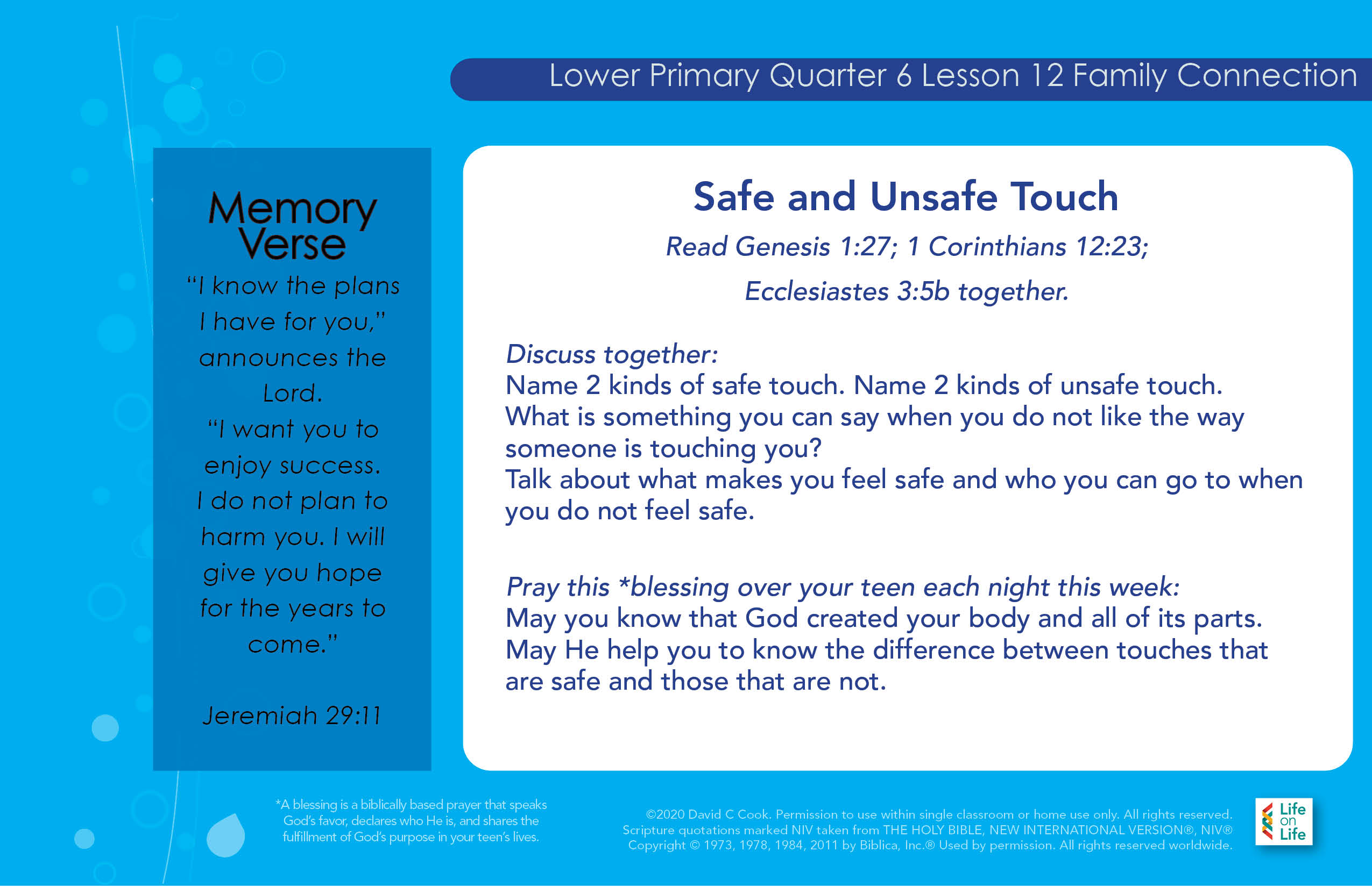 Important Note! This lesson is intended to help children understand the difference between safe and unsafe touch. This will help children understand that God wants them to be safe. Unfortunately, in our broken world, children are often abused. Talk with your leadership before teaching this lesson to find out what help is available if you discover that a child has been abused.